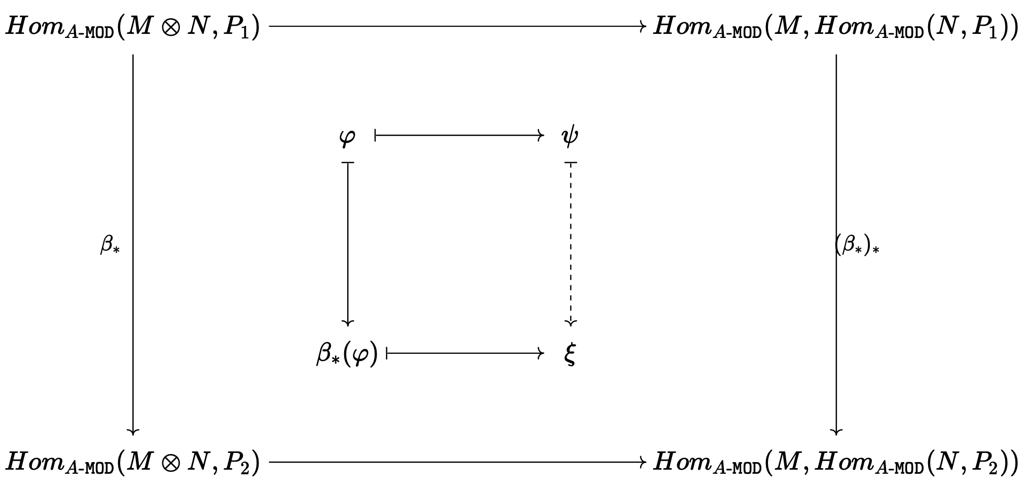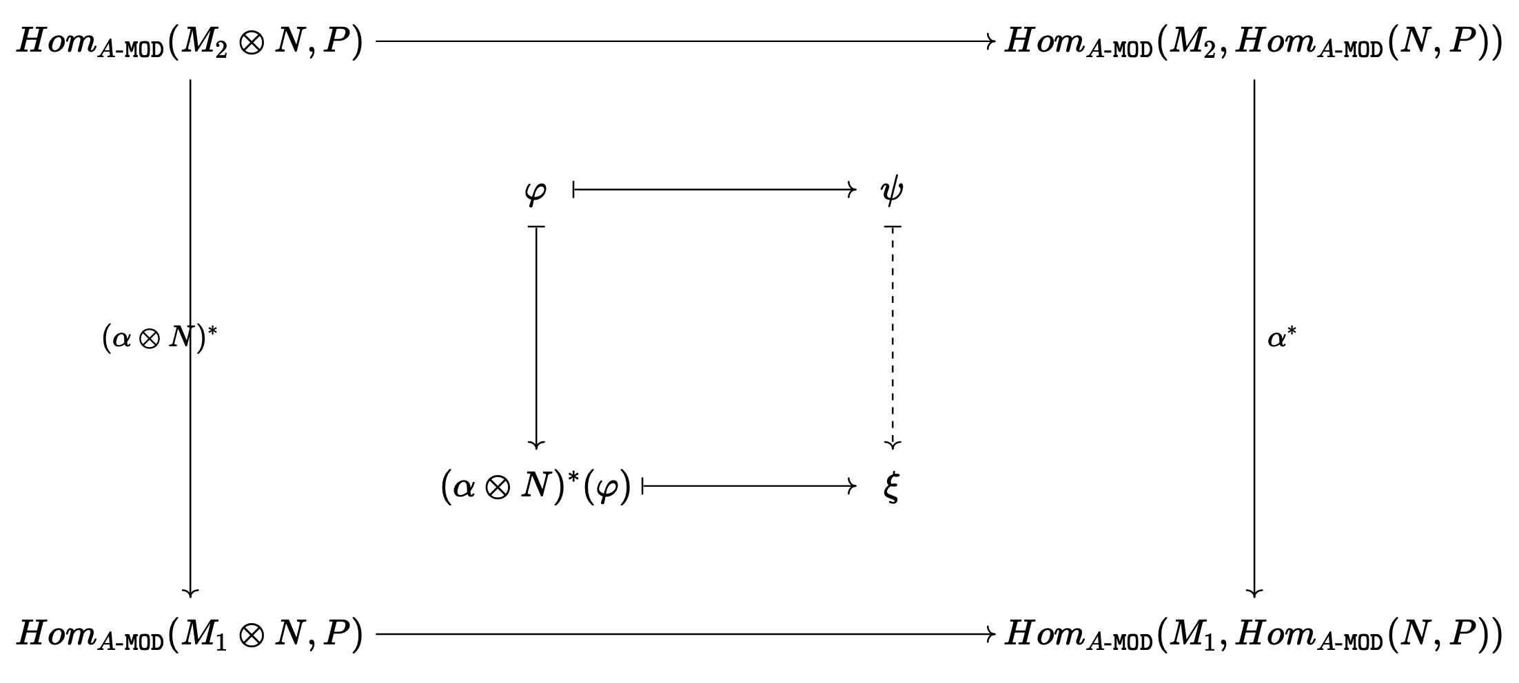 역으로 $A$-linear map $\xi:M\longrightarrow Hom_{A\text{-}\mathtt{MOD}}(N,P)$가 주어질 때마다 $A$-bilinear map $\eta:M\times N\longrightarrow P$ defined by $\eta(m,n):=\xi(m)(n)$을 얻을 수 있고, tensor product의 universal property에 의해 unique $A$-linear map $\overline{\eta}:M\otimes_A N\longrightarrow P$ such that $\overline{\eta}\circ\otimes=\eta$를 구할 수 있다. 이로부터 mapping $\xi\mapsto\overline{\eta}$를 하나 더 얻었다.