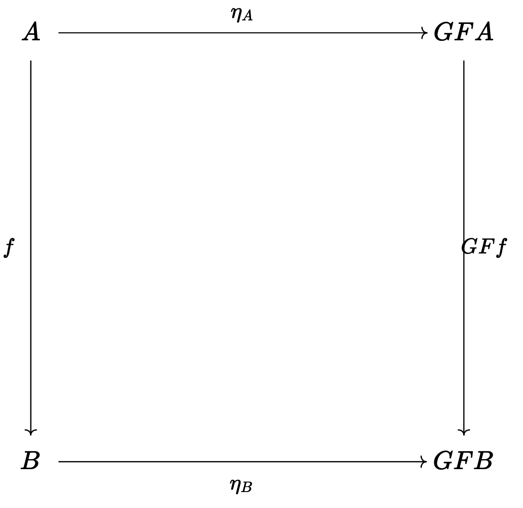 이로부터 $$ \eta_B\circ f = GFf\circ\eta_A $$가 성립함을 알고, 이것은 정확히 $\eta$의 naturality를 설명하는 식이다. diagram으로 보면 아래와 같다.
