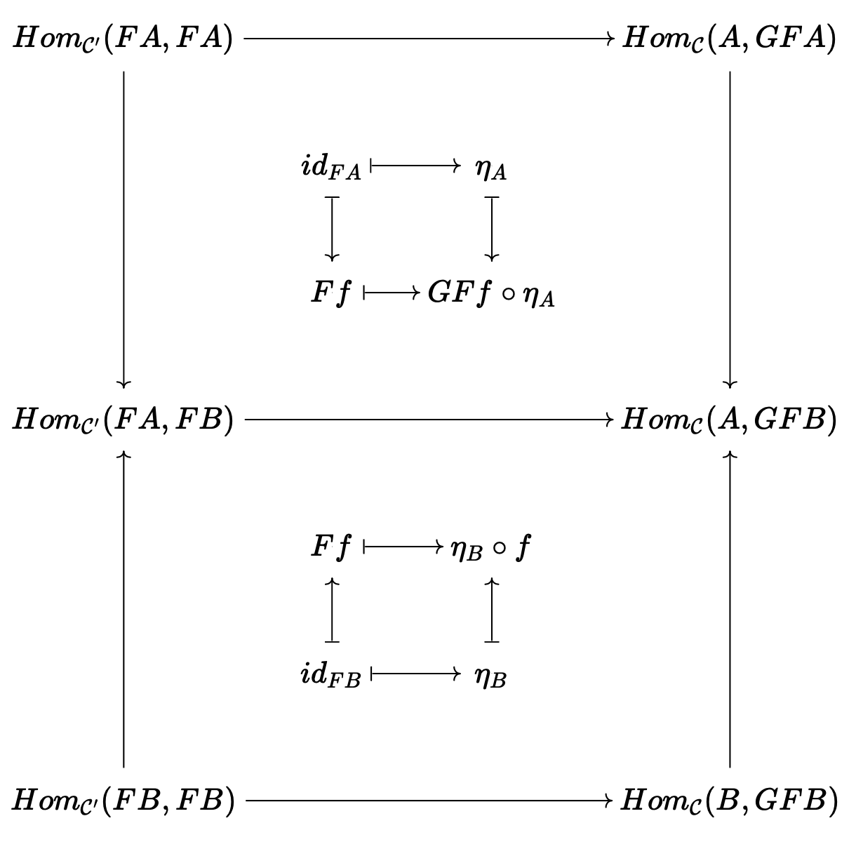 다시 말해, 임의의 object $A\in\mathcal{C}$, $B\in\mathcal{C}'$에 대하여, 아래의 natural bijection이 성립한다는 뜻이다.