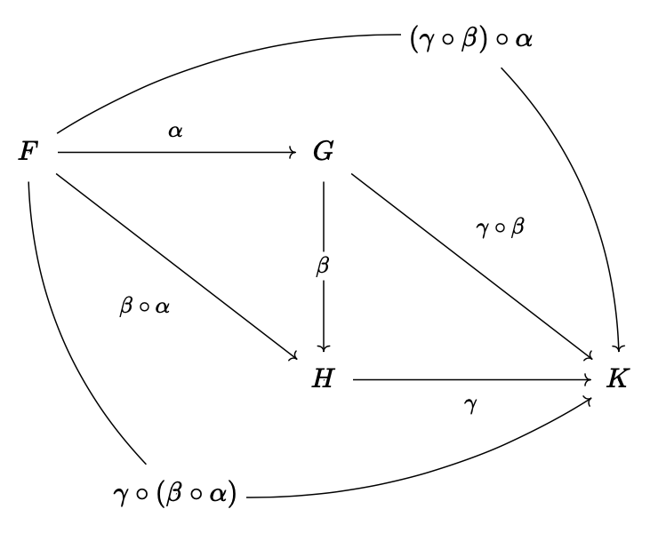 Functors $F,G,H,K:\mathcal{C}\longrightarrow\mathcal{D}$와 natural transformations $\alpha:F\longrightarrow G$, $\beta:G\longrightarrow H$, $\gamma:H\longrightarrow K$에 대하여, 아래의 diagram이 commute한다.