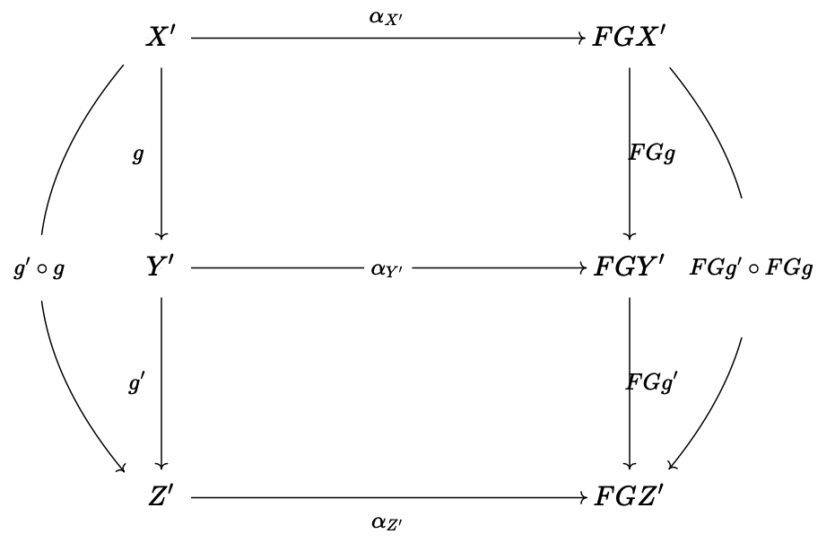 다시 한 번 $g'\circ g$에 위 논리를 적용하면 unique morphism $f:GX'\longrightarrow GZ'$이 있어 $Ff=FGg'\circ FGg=F(Gg'\circ Gg)$을 만족하게 된다.