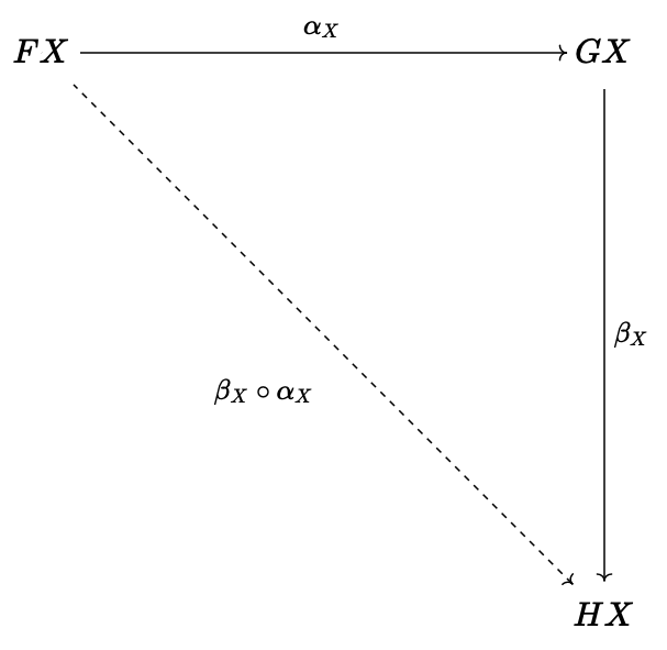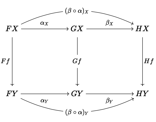 Functors $F,G,H:\mathcal{C}\longrightarrow\mathcal{D}$에 대하여 natural transformations $\alpha:F\longrightarrow G$, $\beta:G\longrightarrow H$가 주어졌다고 하자.