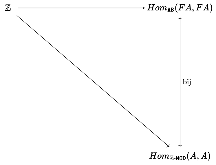 두 category가 equivalent 하다는 것과의 관계성은 다음의 그림으로 대체한다. (forgetful functor $F:\mathbb{Z}\text{-}\mathtt{MOD}\longrightarrow\mathtt{AB}$는 equivalence. $A$는 $\mathbb{Z}$-module.)