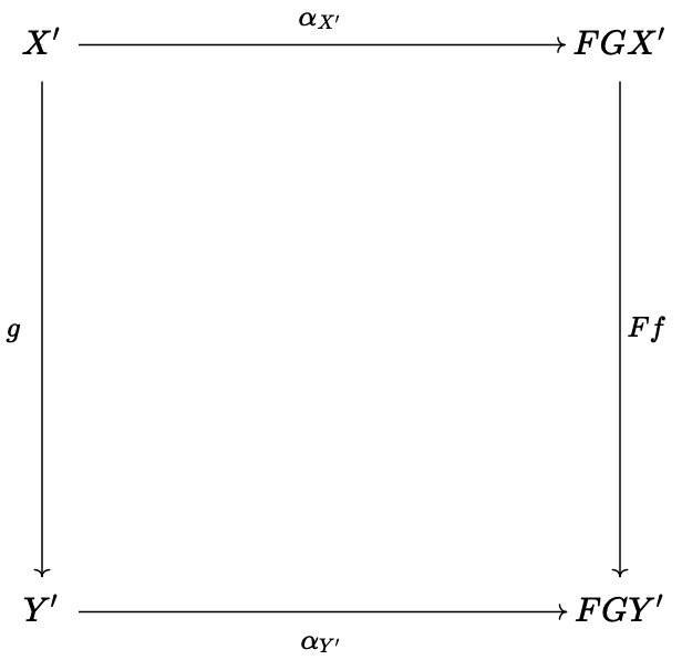 identity morphism $id_{X'}:X'\longrightarrow X'$에 대해 unique morphism $f:GX'\longrightarrow GX'$이 존재해서 $Ff=\alpha_{X'}\circ id_{X'}\circ \alpha_{X'}^{-1}=id_{FGX'}$를 만족시킨다.