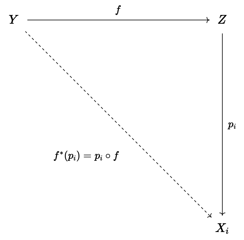 morphism: function $f:Y\longrightarrow Z$가 주어질 때마다 각 function $p_i:Z\longrightarrow X_i$는 $f$에 대한 pull-back $$f^*(p_i)=p_i\circ f$$를 가지므로 $Ff((p_i)):=(f^*(p_i))$로 정의.