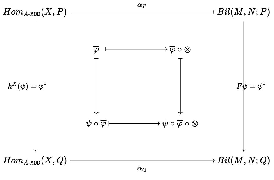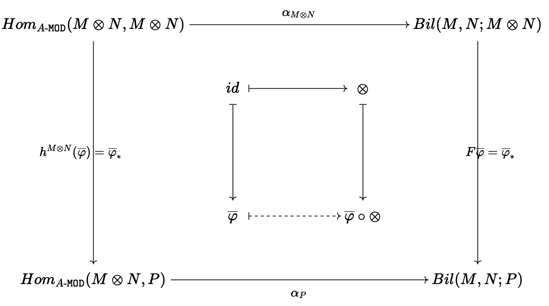 각 $A$-module $P$마다 $$\alpha_P:Hom_{A\text{-}\mathtt{MOD}}(X,P)\longrightarrow Bil(M,N;P)$$는 $$\overline{\varphi}\mapsto\overline{\varphi}\circ\otimes$$로 정의한다.