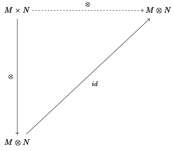 이를 확인하기 위하여 아래의 commutative diagram을 보라. 결국, 점선으로 표현된 morphism이 우리가 찾는 $A$-bilinear map인데, 이는 다름 아닌 $\otimes$인 것이다.