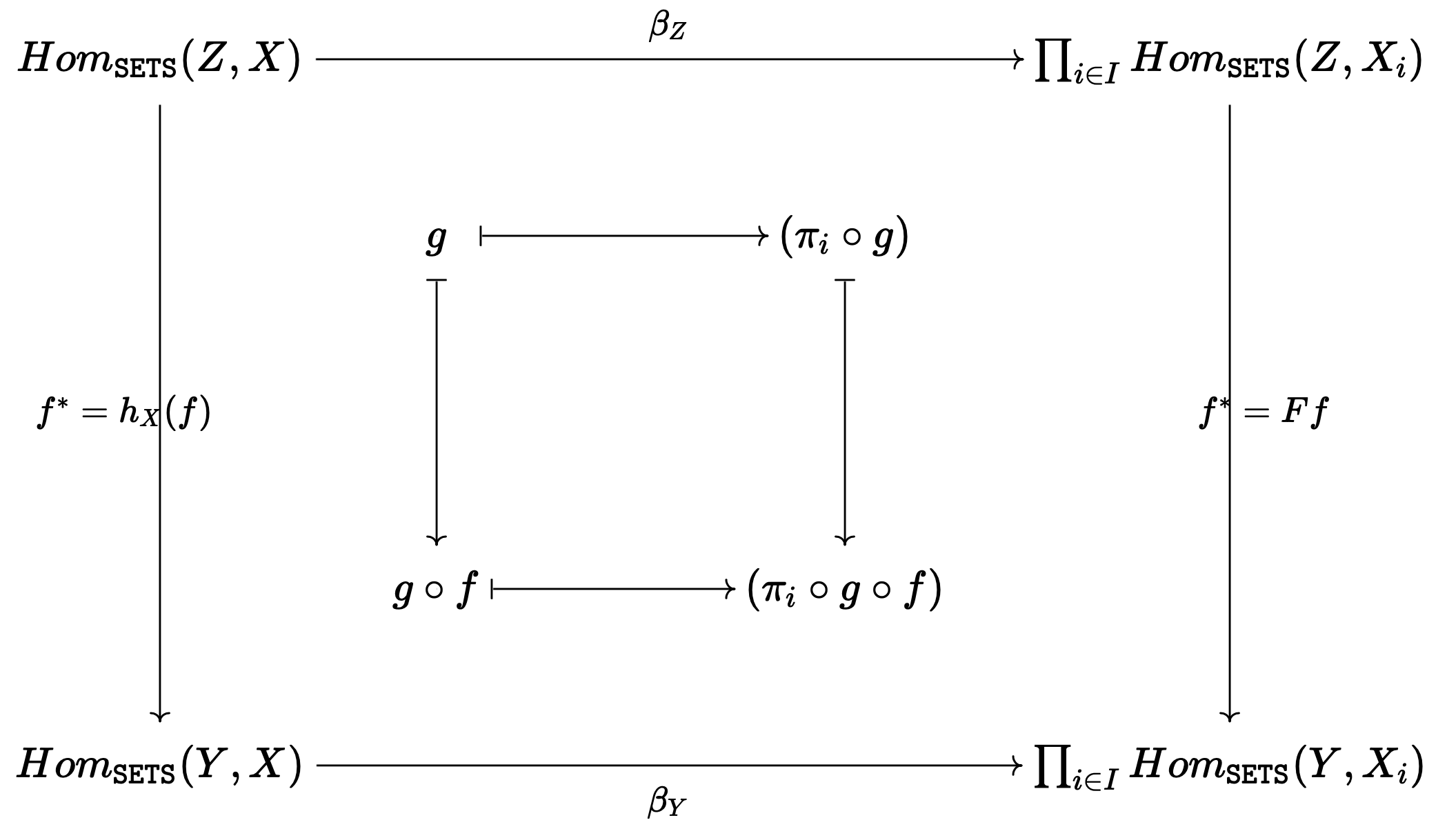 더 나아가 product의 universal property에 의하여 모든 $g_i:Y\longrightarrow X_i$에 대하여 $\pi_i\circ g=g_i$를 만족시키는 unique function $g:Y\longrightarrow X$가 존재하고, 이 대응하에 $\beta_Y$가 bijection이 됨을 확인할 수 있다.